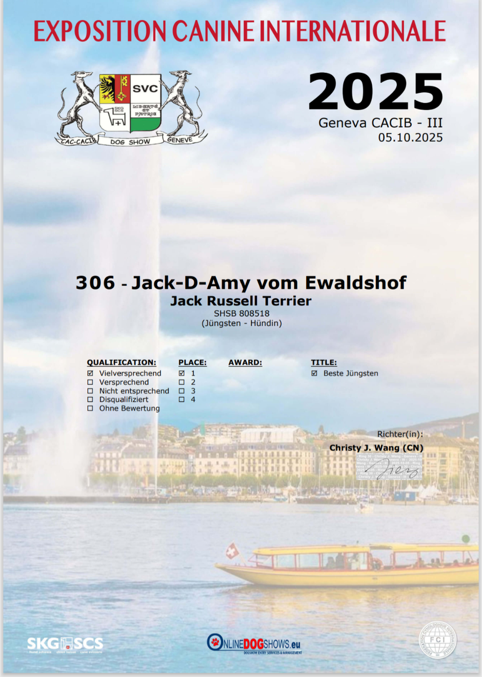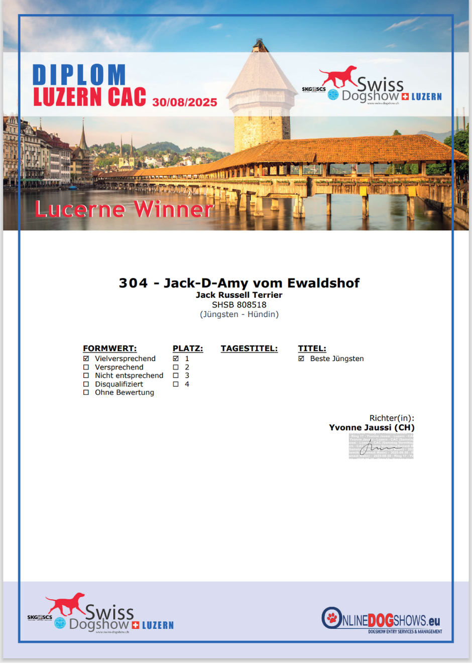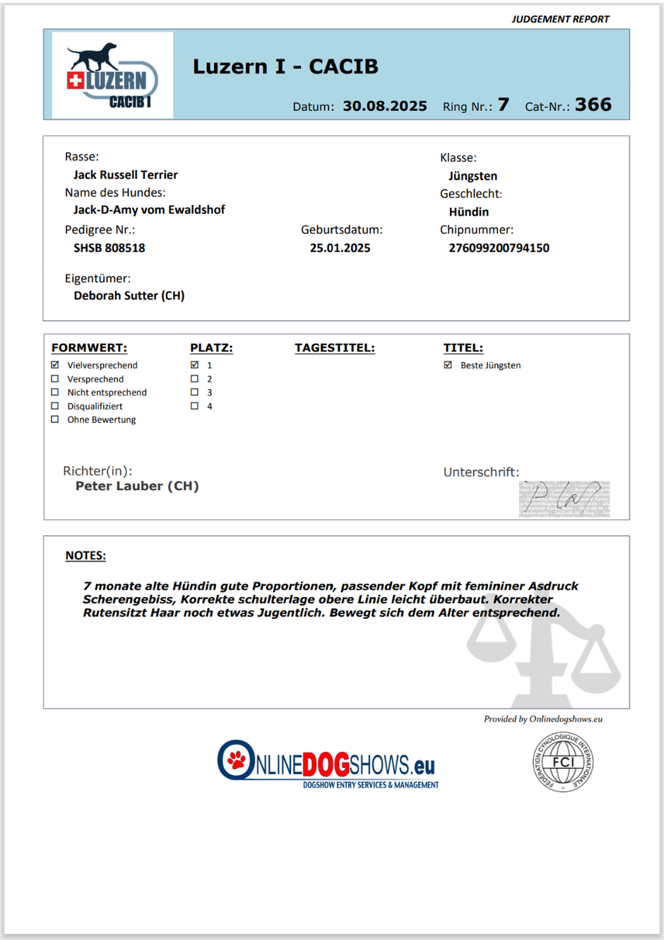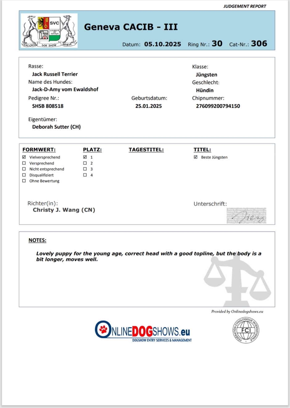 An den Swiss DogShow's 2025 in Aarau, Luzern und Genf wurde Love 5mal mit der besten Note "vielversprechend" belohnt. An der Russell Terrier Clubshow wurde sie Jüngsten Siegerin🥇.